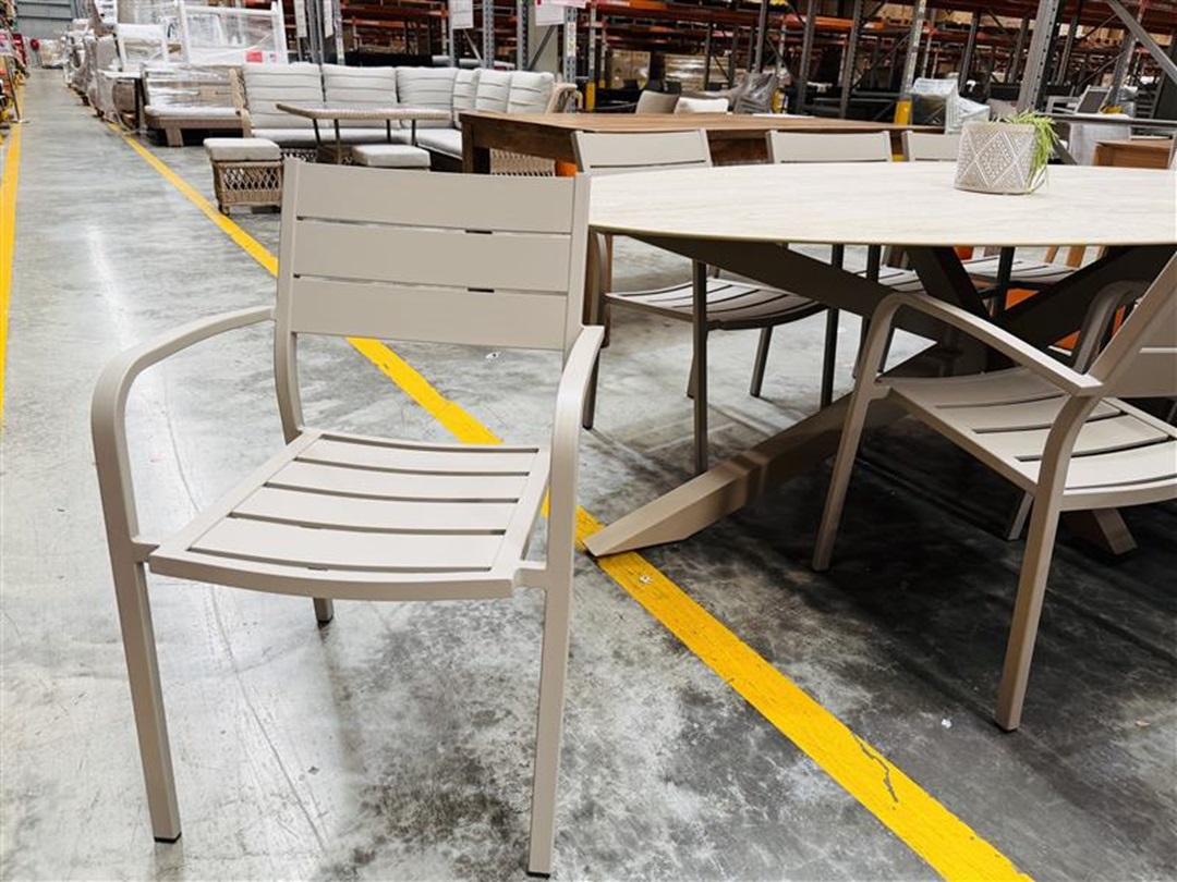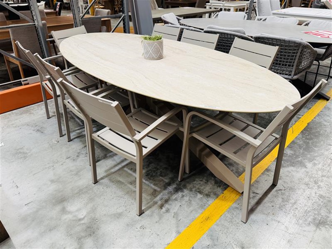A contemporary outdoor dining setting featuring a large table and eight matching chairs in a stylish taupe finish. Built for durability and comfort, it’s ideal for outdoor entertaining and family gatherings.