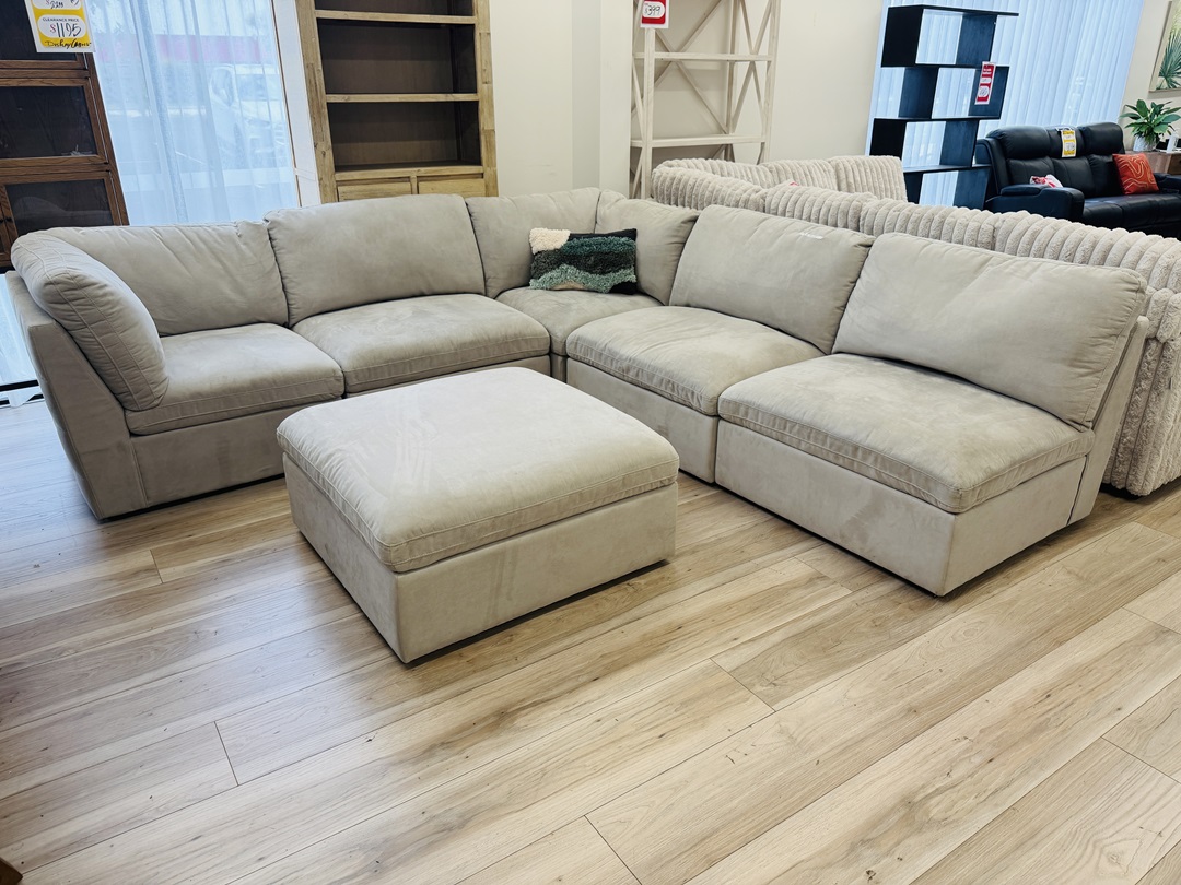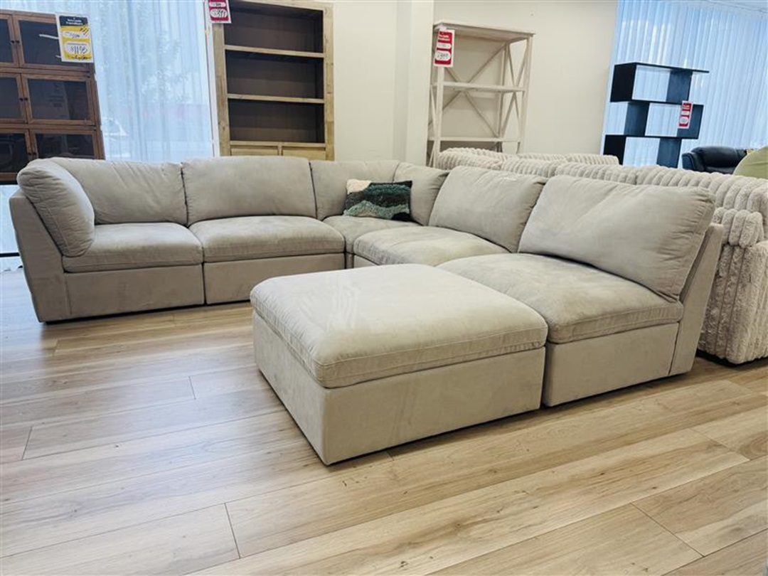 A spacious corner sofa upholstered in elegant taupe fabric. Its modular design and included ottoman allow flexible seating arrangements while providing exceptional comfort for family living.