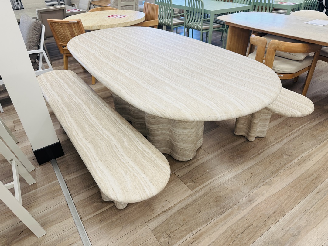 This unique outdoor bench setting showcases a sculptural wave design crafted from solid cement for a bold, modern statement. Durable and eye-catching, it offers practical seating while enhancing the aesthetic of outdoor spaces.