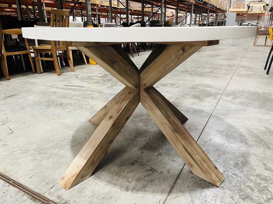 This round dining table pairs a white cement top with sturdy timber legs for a modern contrast. Its durable surface and sleek design make it ideal for everyday dining. A statement piece for contemporary homes.