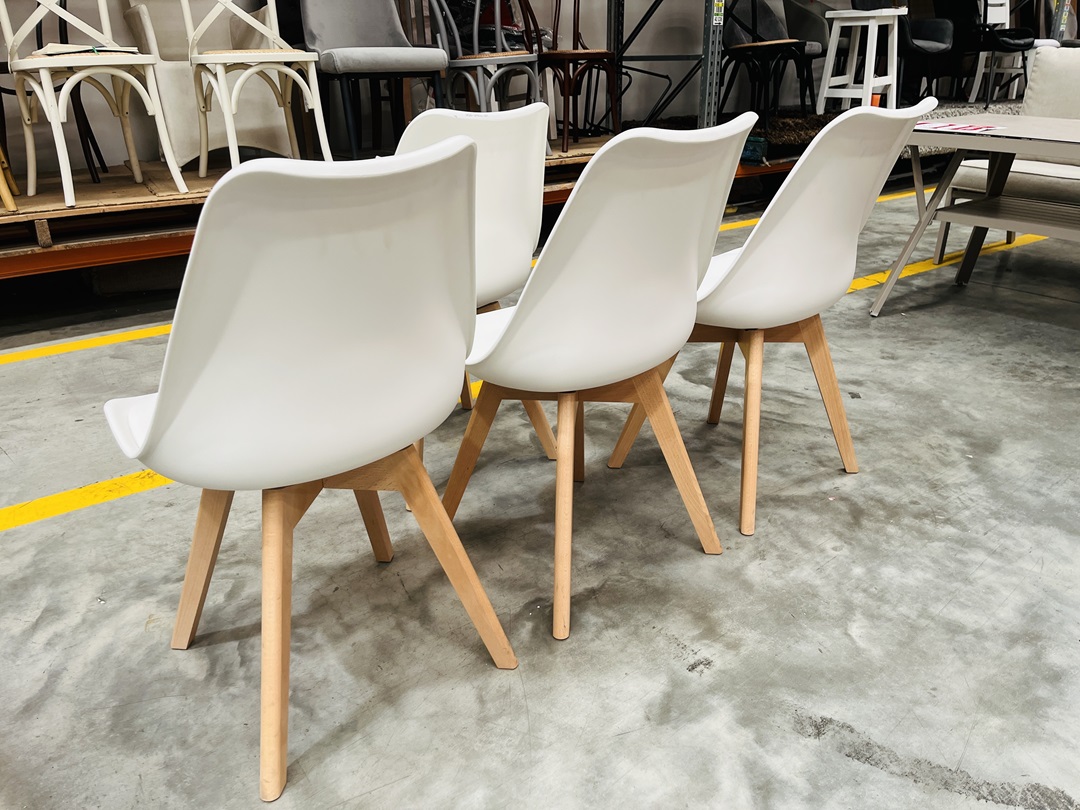 A modern dining chair combining a white seat with natural timber legs. Its clean design fits seamlessly into any dining space. Comfortable and versatile for everyday use.