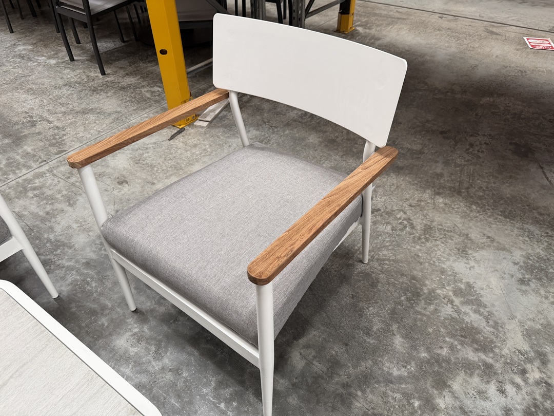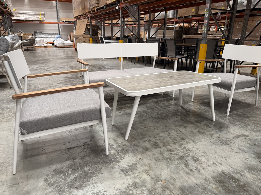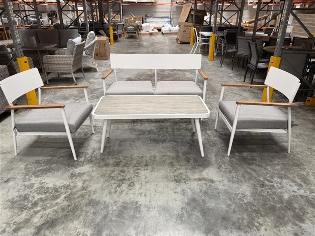 A modern 4-piece outdoor sofa set in clean white and grey tones. Includes a sofa, two armchairs, and a stylish coffee table for a complete outdoor relaxation space.