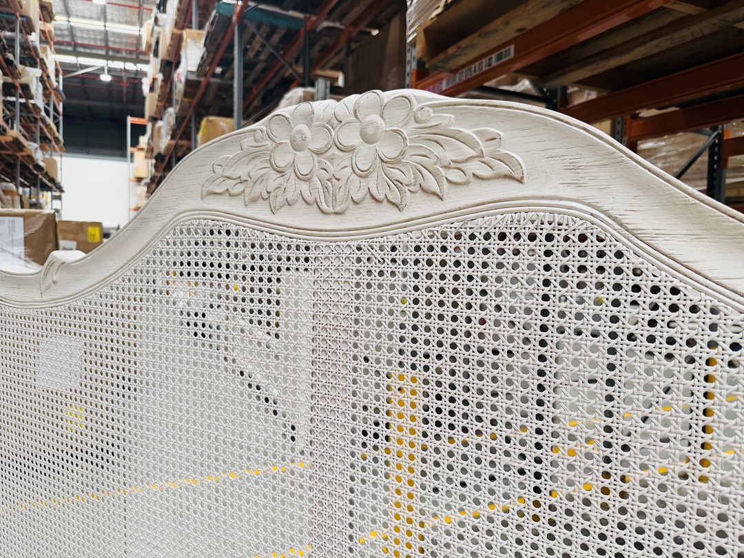 This king bed combines sturdy timber construction with detailed rattan panels and a beautiful floral design. The white finish adds a soft, airy feel, making it a striking centrepiece that brings charm and character to the bedroom.