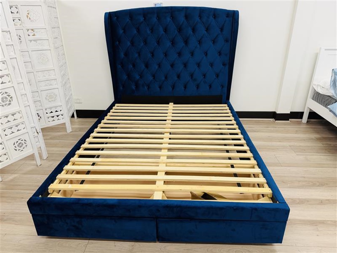 This upholstered bed features a contemporary stone grey fabric finish, ideal for a neutral or minimalist bedroom theme. The integrated drawers provide smart, space-saving storage for linens, clothing, or seasonal items.