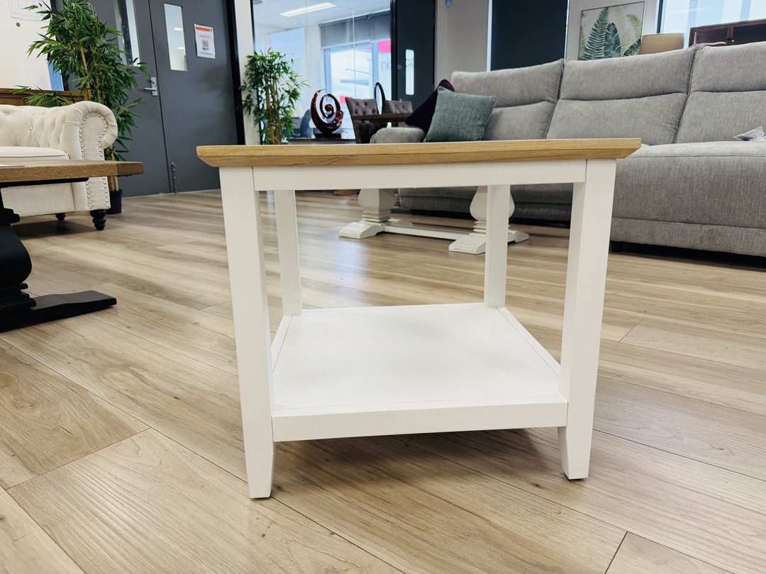 The White Timber Square Side Table with Natural Wash Top features a crisp white base paired with a softly washed natural timber top, perfect for adding light storage and surface space beside sofas or beds.