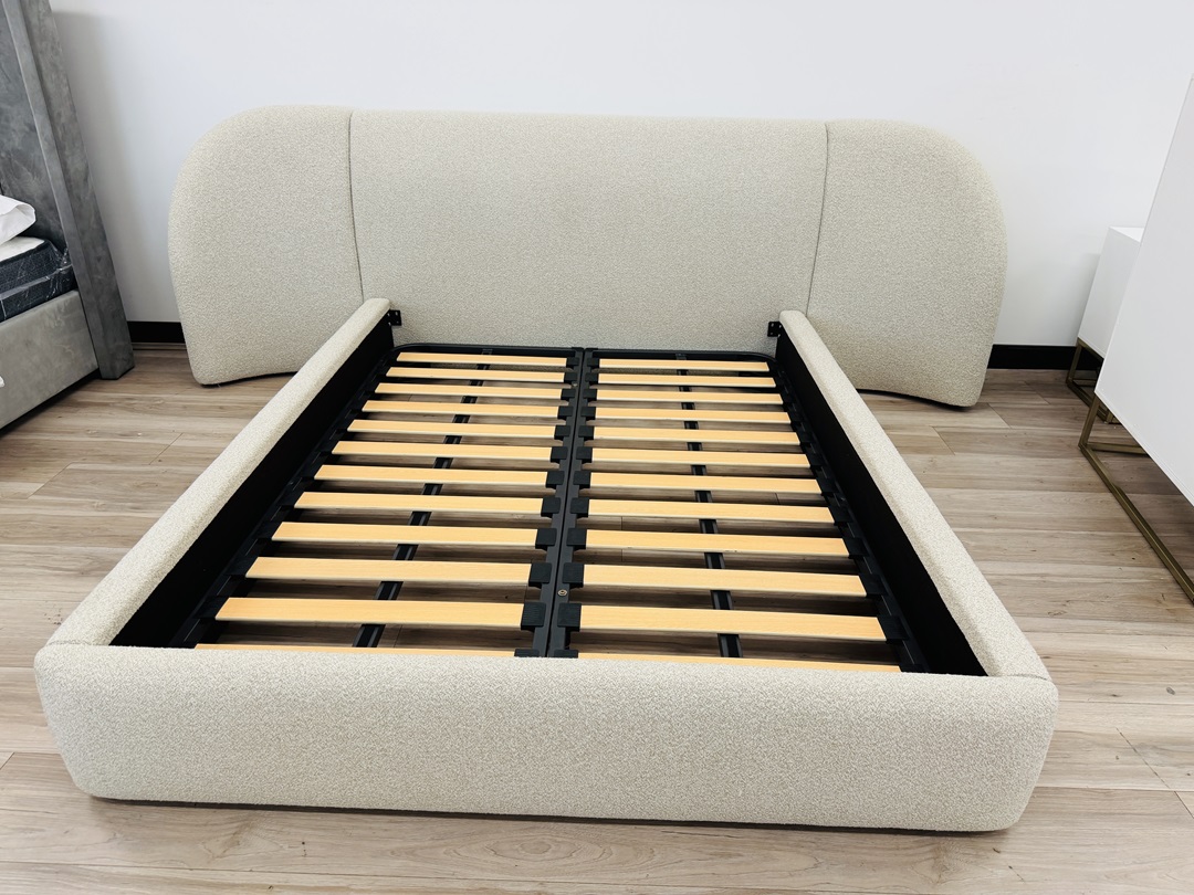 Elegant and practical, this queen bed is upholstered in soft light beige fabric with two under-bed drawers for convenient storage. Its neutral tone complements any bedroom décor. Built for comfort and functionality.