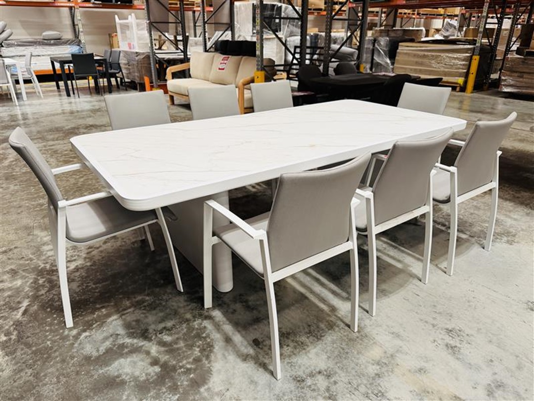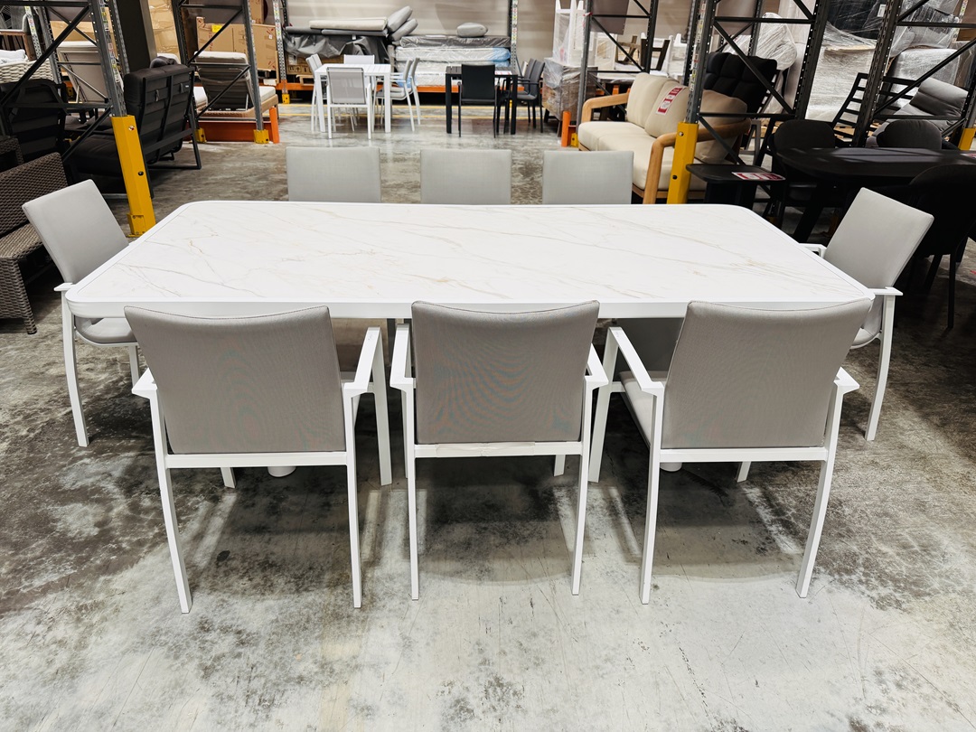 Original price was: $5,300.00.$2,695.00Current price is: $2,695.00.A contemporary outdoor dining set featuring a marble-look tabletop and eight matching chairs. Designed for style and durability, ideal for outdoor dining and entertaining.