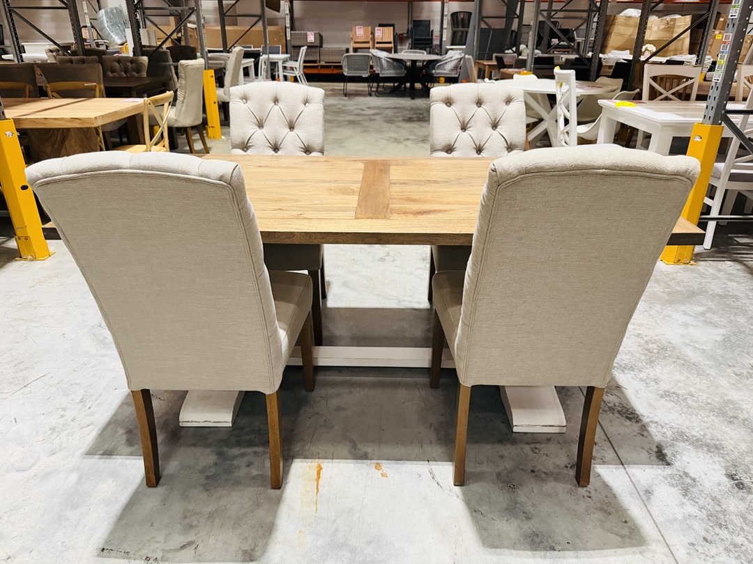 Original price was: $2,500.00.$1,299.00Current price is: $1,299.00.A stylish dining set featuring a timber table with a sturdy pedestal base, paired with four comfortable beige fabric chairs. Perfect for smaller dining spaces while maintaining elegance and functionality.