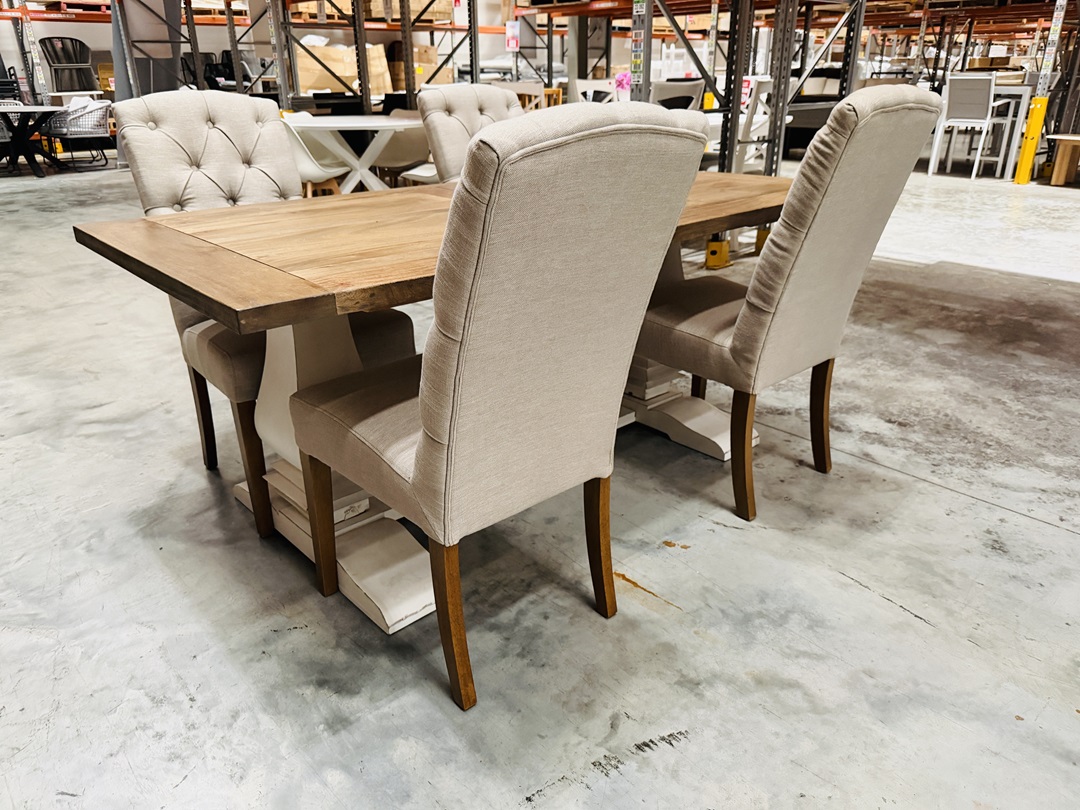 Pedestal Leg Timber Dining Table with 4 Beige Fabric Chairs Set