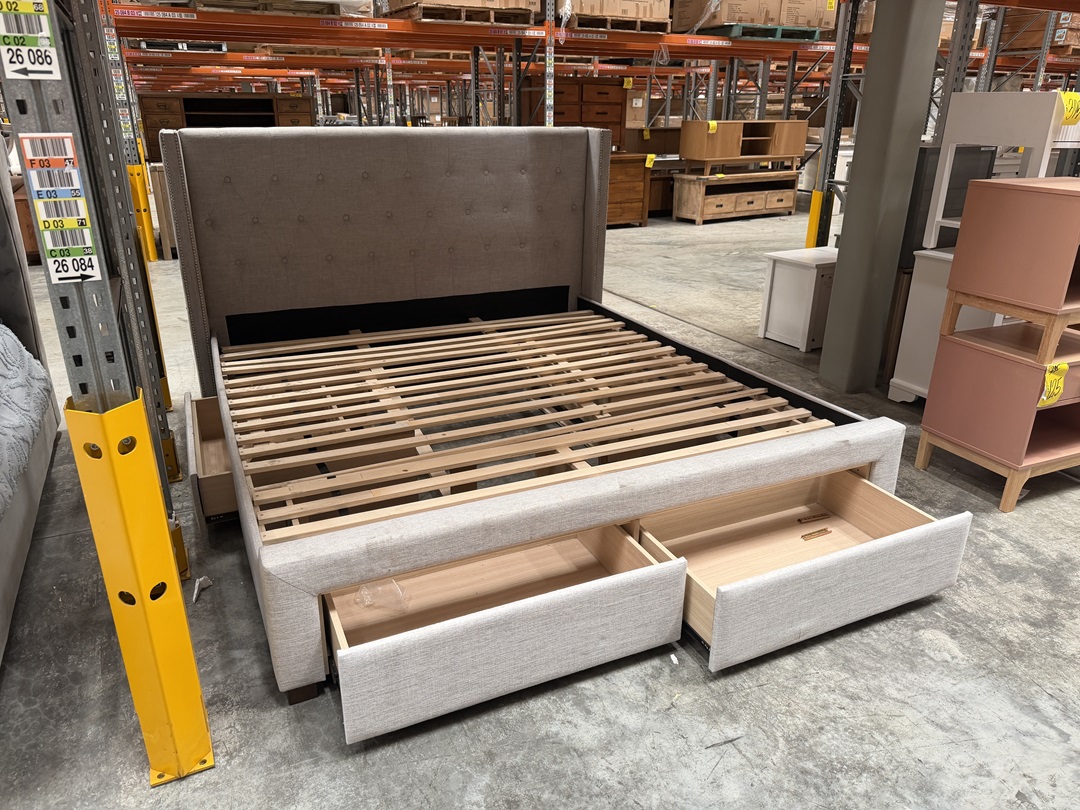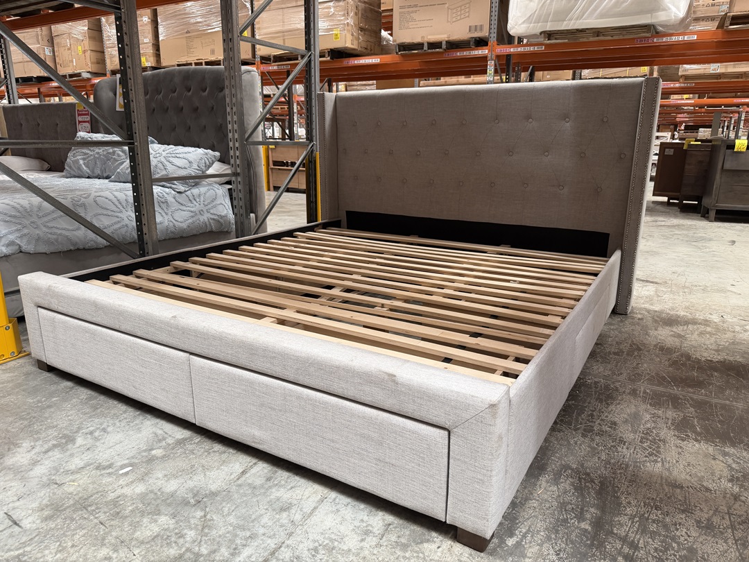 This stylish king bed features soft light grey fabric upholstery paired with a padded headboard for added comfort and visual appeal. Four built-in drawers provide generous storage space, making it a practical and elegant option.