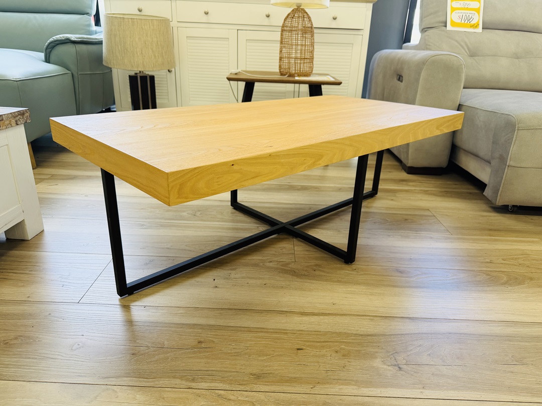 This coffee table combines a warm natural timber top with strong black metal legs for a modern industrial look. Durable and stylish, it provides a practical surface for everyday use while acting as a striking centrepiece in your living area.