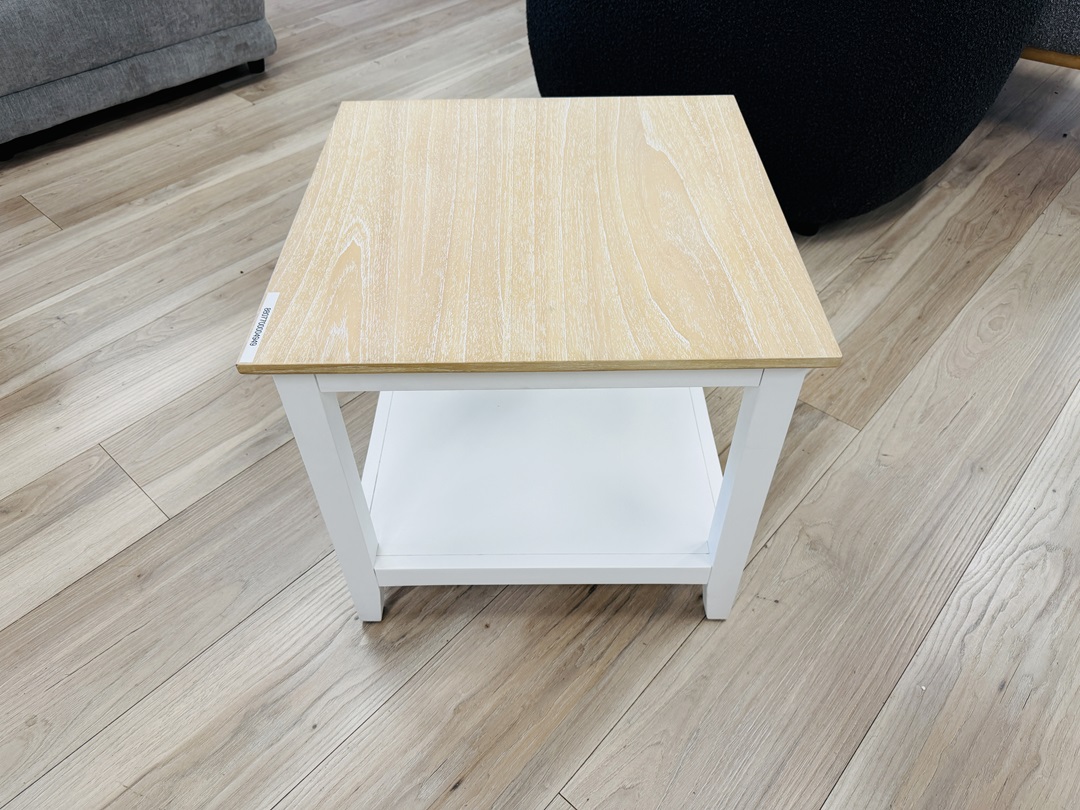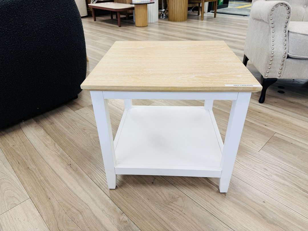 The White Timber Square Side Table with Natural Wash Top features a crisp white base paired with a softly washed natural timber top, perfect for adding light storage and surface space beside sofas or beds.