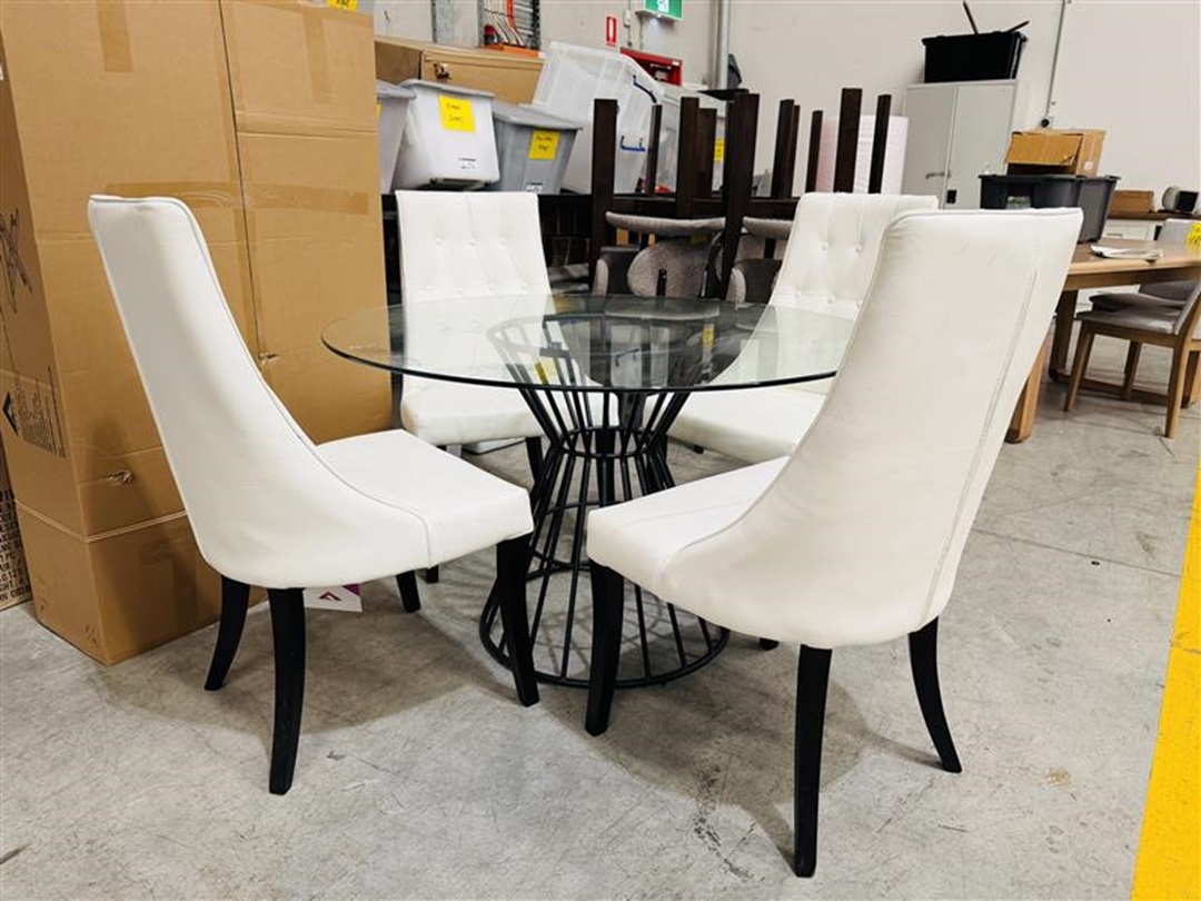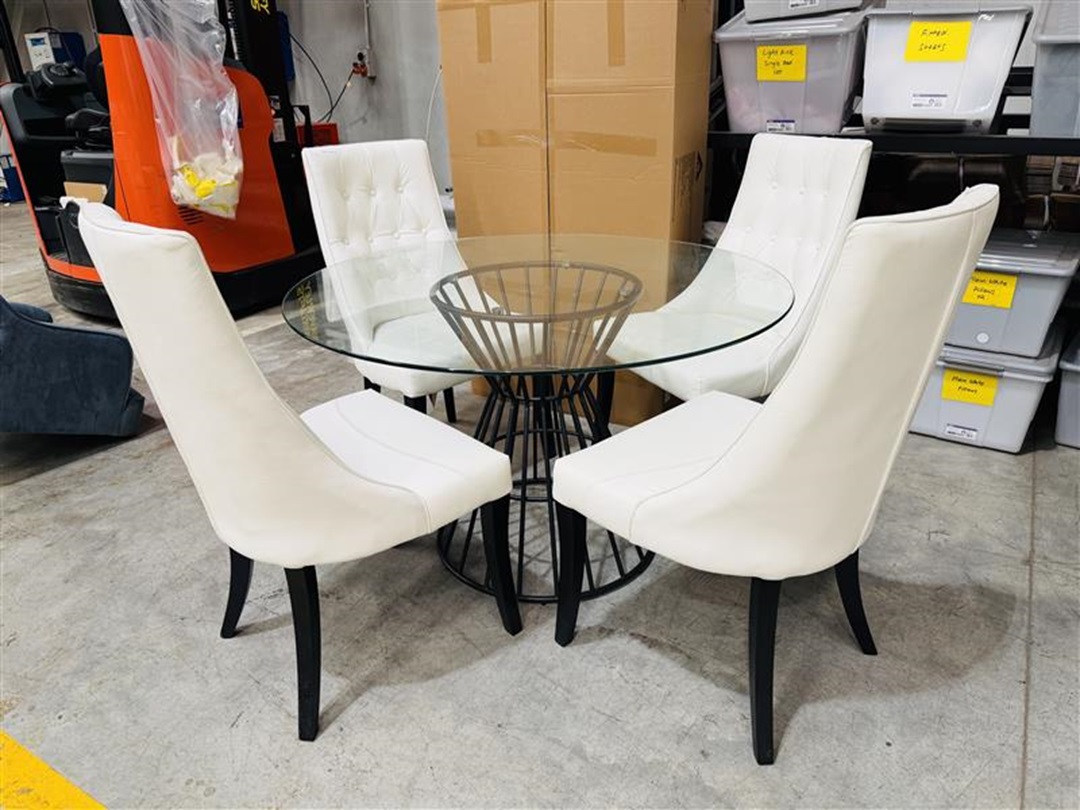 5pc Round Dining Set with Glass Table & White Leather Chairs